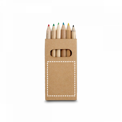 6 houten kleurpotloden om te tekenen verpakt in een kartonnen doos. 45 x 90 x 9 mm
