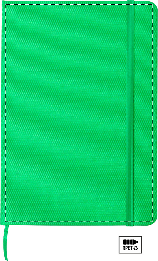 RPET polyester bekleed notitieboek met 80 gelinieerde vellen, boekenlegger en rubberen band. A5 formaat.