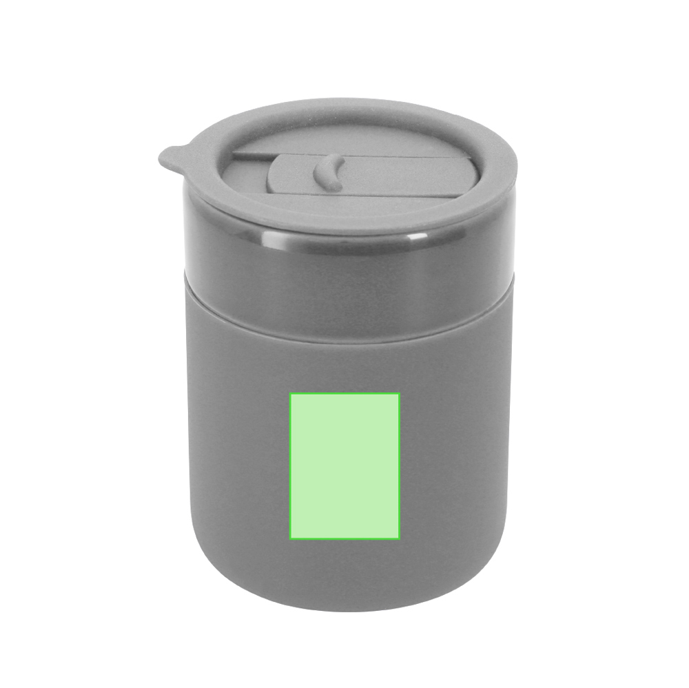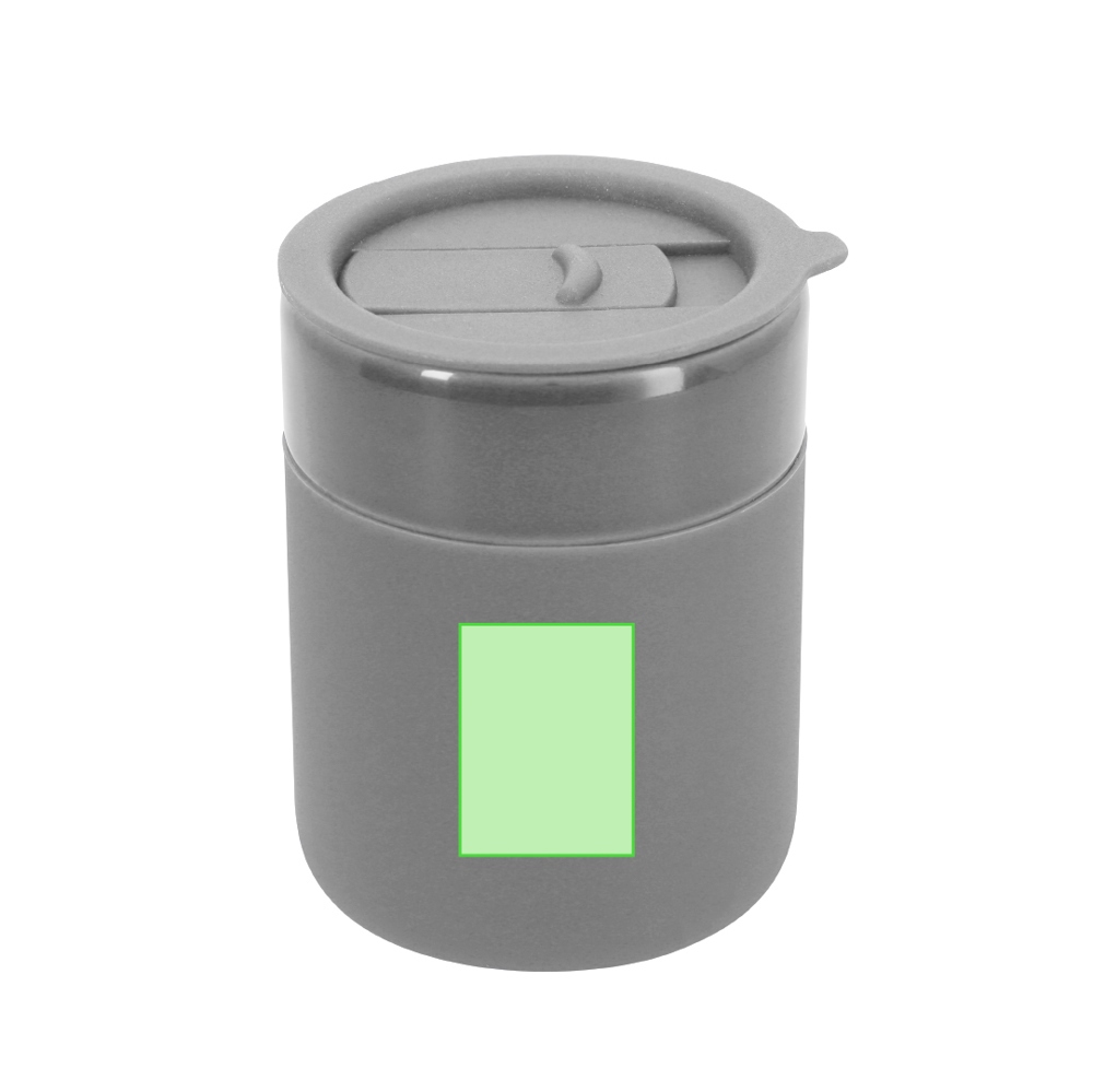 Thermische beker met een inhoud van 350 ml, gemaakt van roestvrij staal binnen en buiten de PP. Het heeft een dubbele wand om de binnentemperatuur te behouden. Hij heeft een veiligheidsdeksel voor luchtdichte sluiting.
