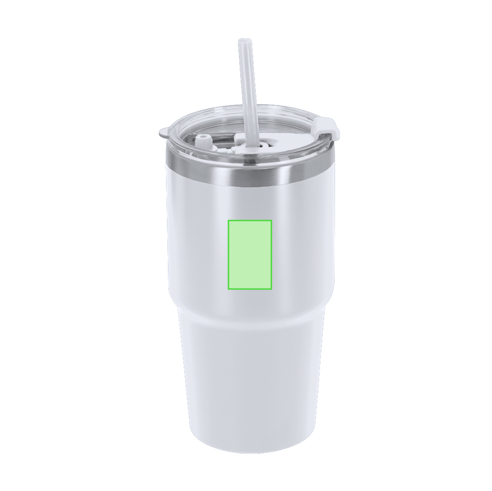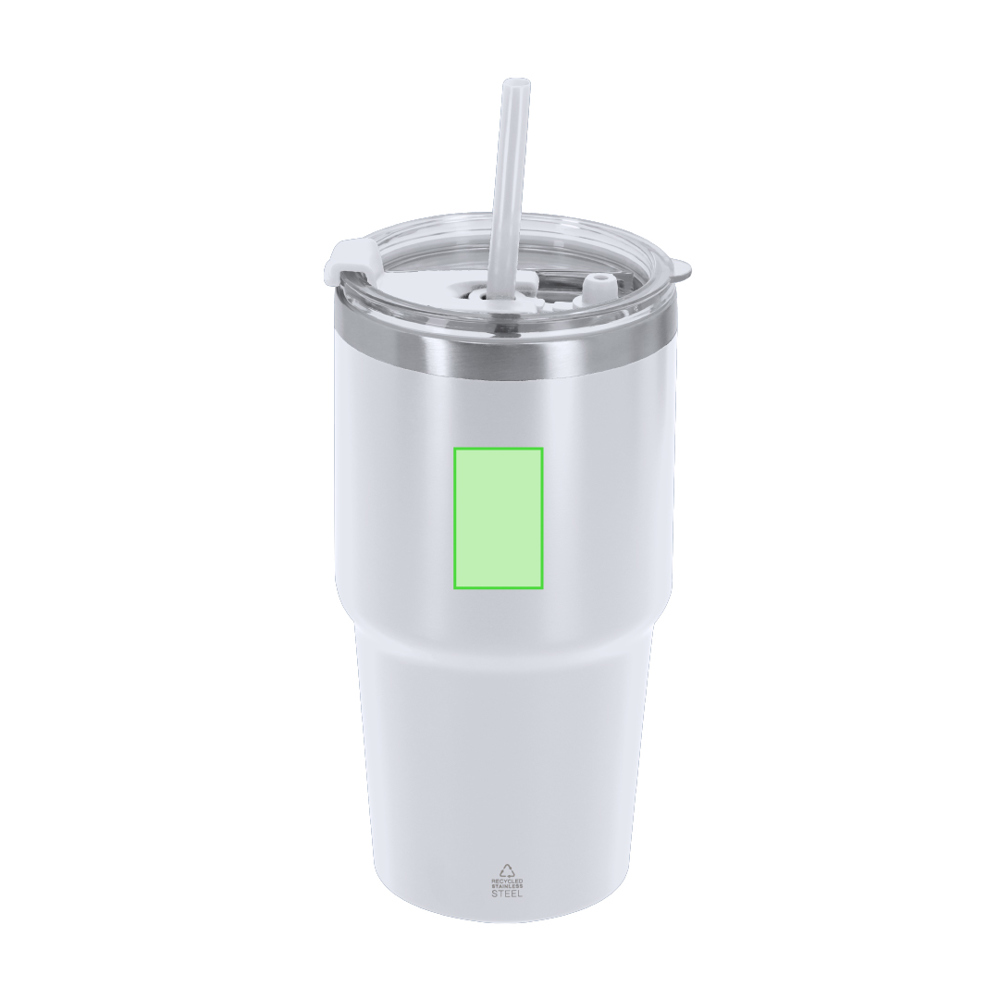 Thermische beker gemaakt van dubbelwandig gerecycled roestvrij staal met een capaciteit van 650 ml. Het heeft een dubbel drinksysteem: gat met hermetische sluiting en geïntegreerd rietje, aangepast aan de gebruiksvoorkeuren. Hij heeft een dop voor luchtdichte sluiting wanneer het rietje wordt verwijderd. Het is ideaal om op je bureau, tafel of op elk oppervlak te hebben waar je rustig van je favoriete drankje kunt genieten. Met een logo van gerecycled roestvrij staal.