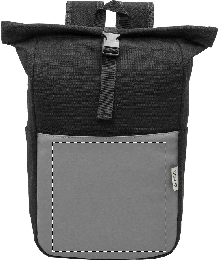 RPET rolltop rugzak met gespsluiting, laptop (14") compartiment en voorvak met ritssluiting.