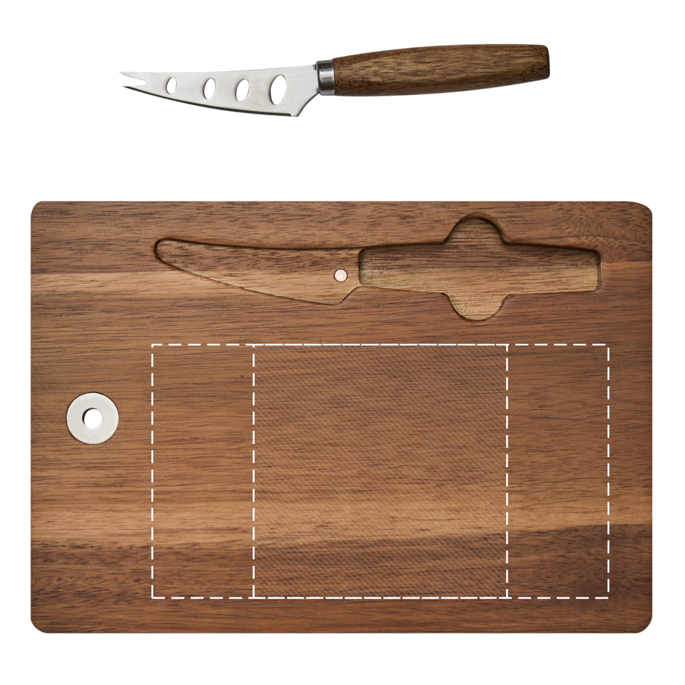 Kaasset CHEESY ACACIA: acaciahouten snijplank, kaasmes met acaciahouten handvat en RVS lemmet, mes kan perfect worden opgeborgen in uitsparing met magneet, gat.