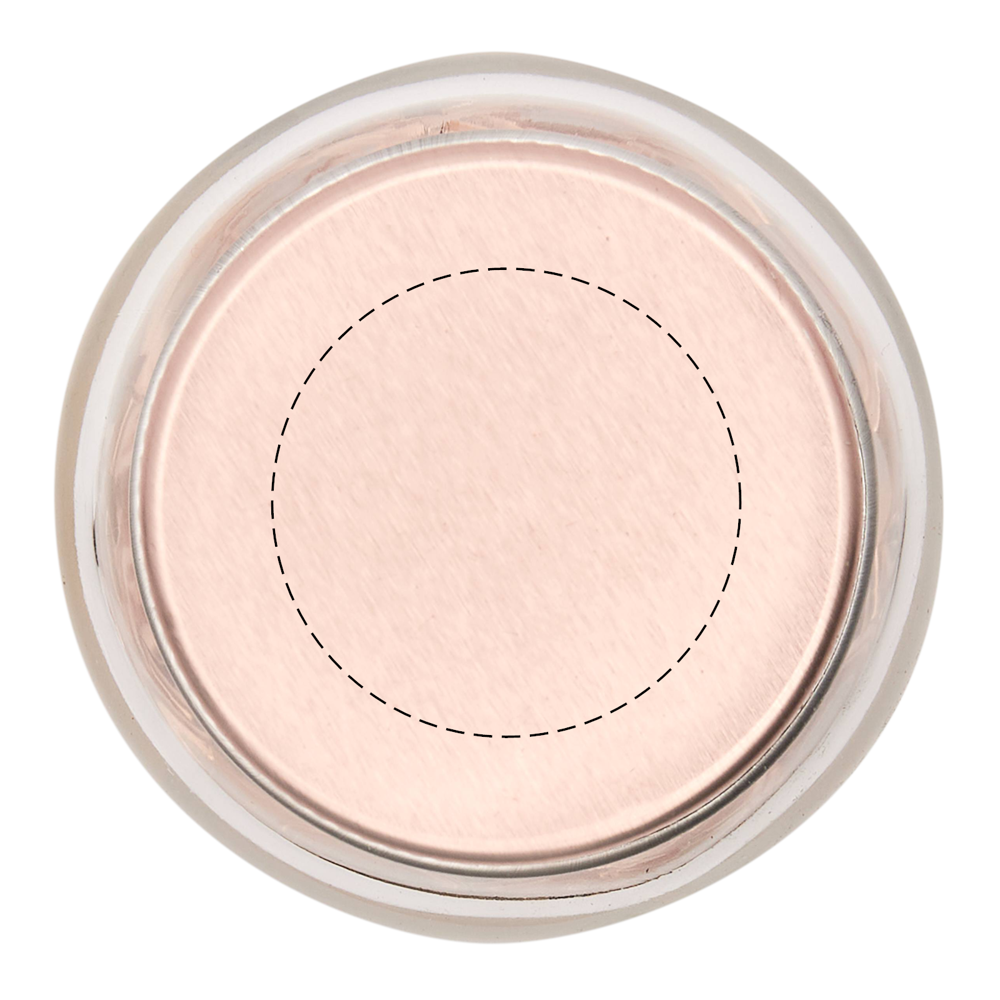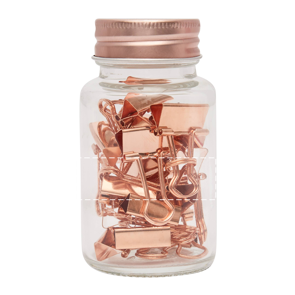 Documentenclips in glas COPPER CLAMP: glazen pot met metalen deksel, gevuld met 20 documentenclips, groot drukoppervlak op deksel voor uw logo.