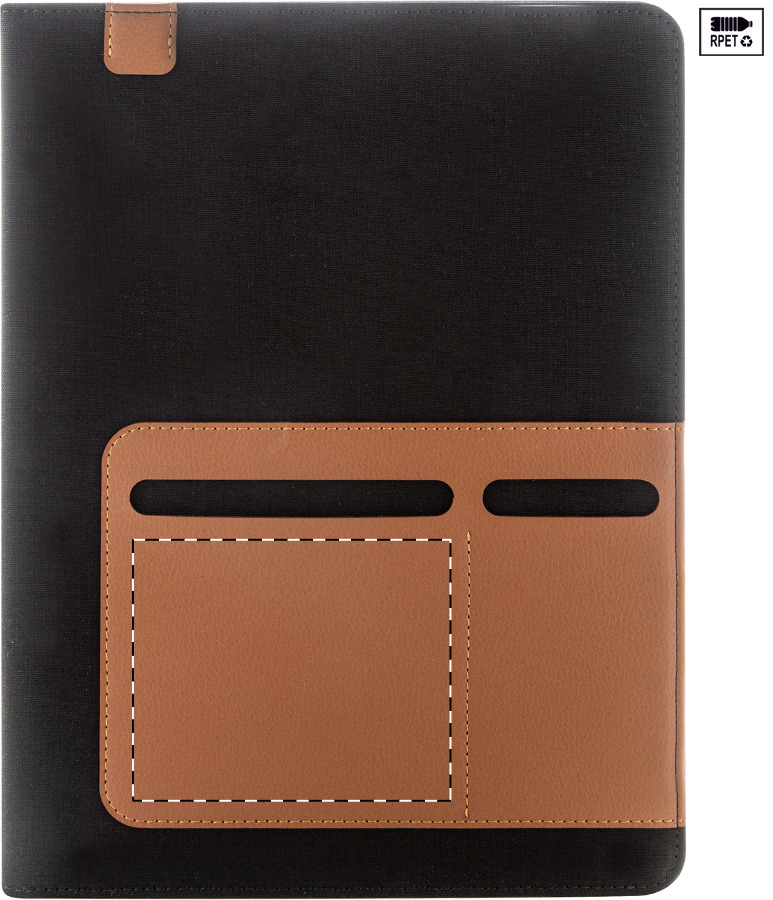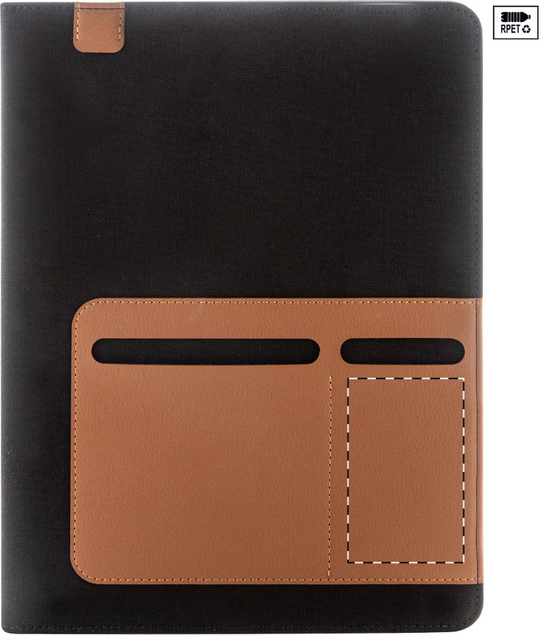 A4-formaat, gerecycled canvas en gerecyclede PU-leren documentmap met meerdere organizerzakken aan de voor- en binnenkant. Met 20 gevoerde vellen notitieblok in gerecycled papier. 70% gerecycled katoen en 30% RPET polyester.