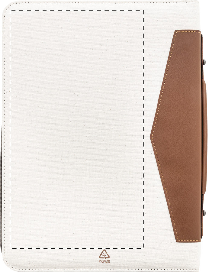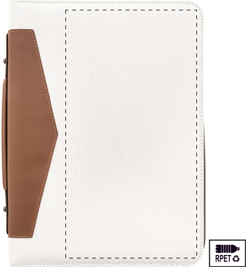 A4-formaat, gerecycled canvas en gerecycled PU-leer, documentenmap met rits en handvat en meerdere opbergvakken aan de binnenkant. Met 20 gelinieerde vellen blocnote in gerecycled papier. 70% gerecycled katoen en 30% RPET polyester.