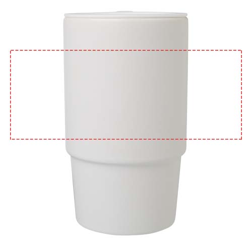 Keramische mok met een grote oversized handgreep om makkelijk mee te nemen en een morsbestendig plastic deksel voor onderweg. De buitenkant heeft een stijlvolle matte afwerking en de fles is vaatwasmachinebestendig voor alle afdrukmethoden. Gepresenteerd in een gerecyclede kartonnen geschenkverpakking. Inhoud: 450 ml.
