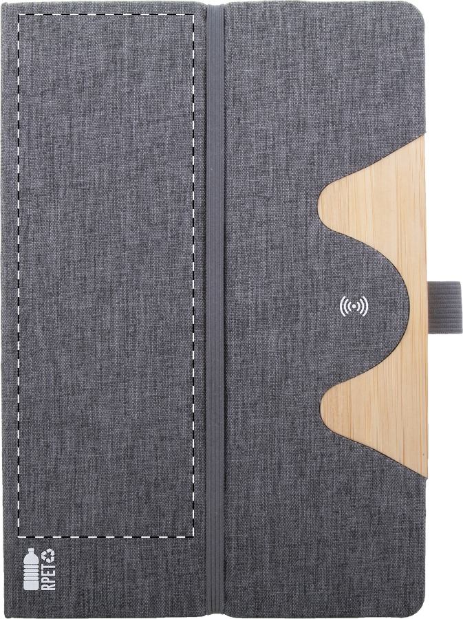 RPET polyester notitieboekje met bamboe inzetstuk, mobiele houderfunctie en ingebouwde draadloze snellader (15W). Met 80 gelinieerde vellen gerecycled papier. A5-formaat. Inclusief USB-oplaadkabel.