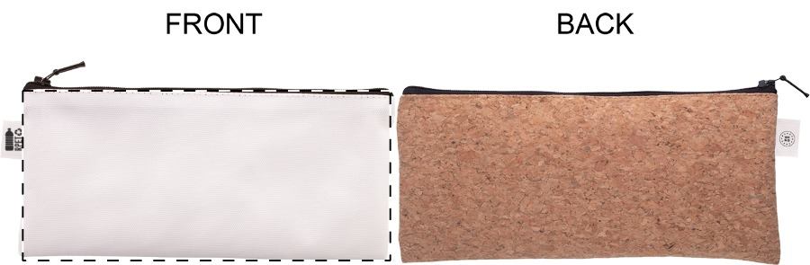 Custom made penetui met rits van 600D RPET polyester met natuurkurken achterkant. Met all-over sublimatie bedrukking en onderscheidend RPET-label. MOQ: 50 stuks.