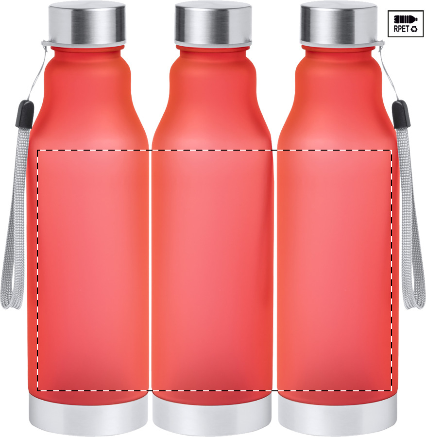 RPET-fles met draagriem, roestvrijstalen dop en bodem, 600 ml. BPA-vrij. Niet geschikt voor koolzuurhoudende dranken.