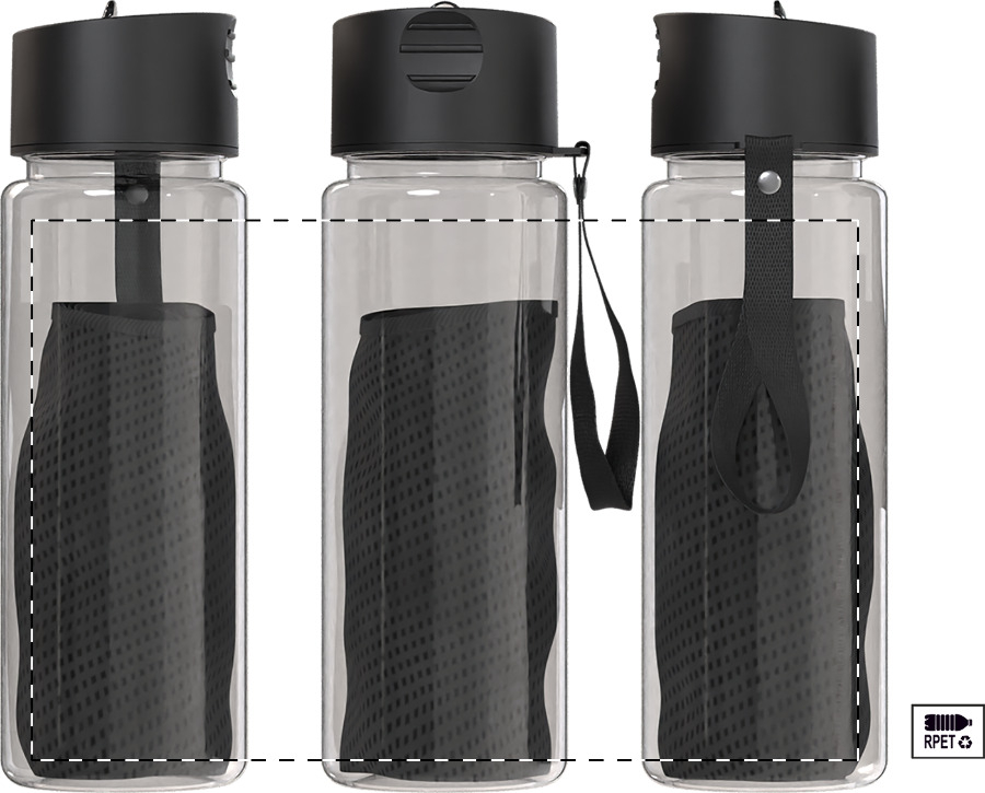 RPET polyester koelsporthanddoek in RPET sportfles met PP flip-top drinkdeksel, geïntegreerd rietje, en draagriem. 800 ml. BPA-vrij. Niet geschikt voor koolzuurhoudende dranken. Handdoekmaat: 30×80 cm.
