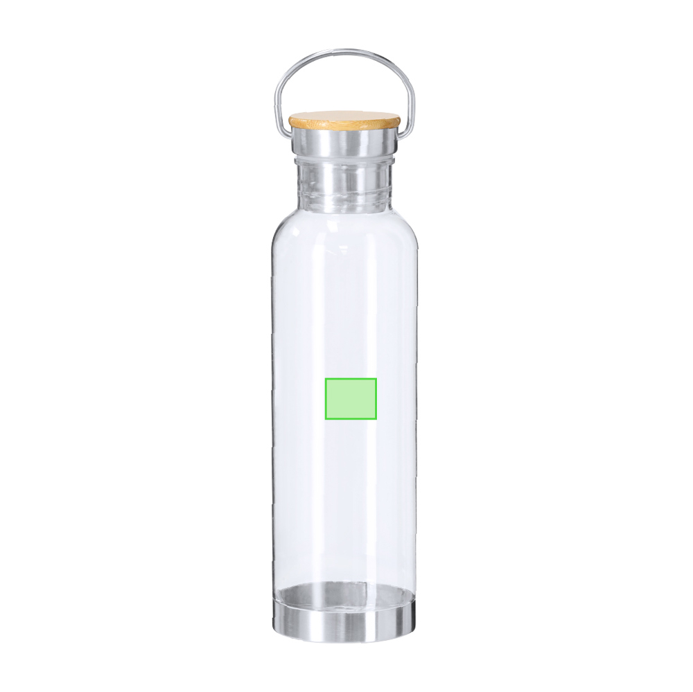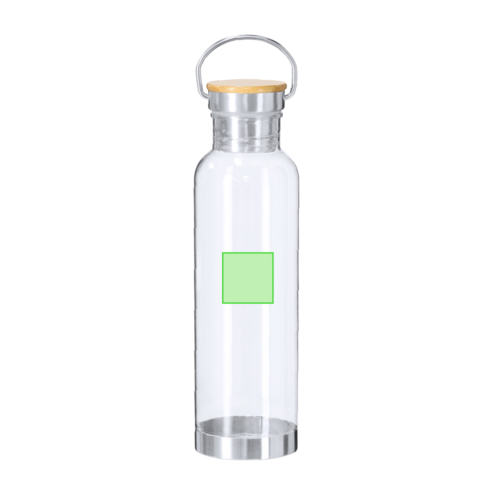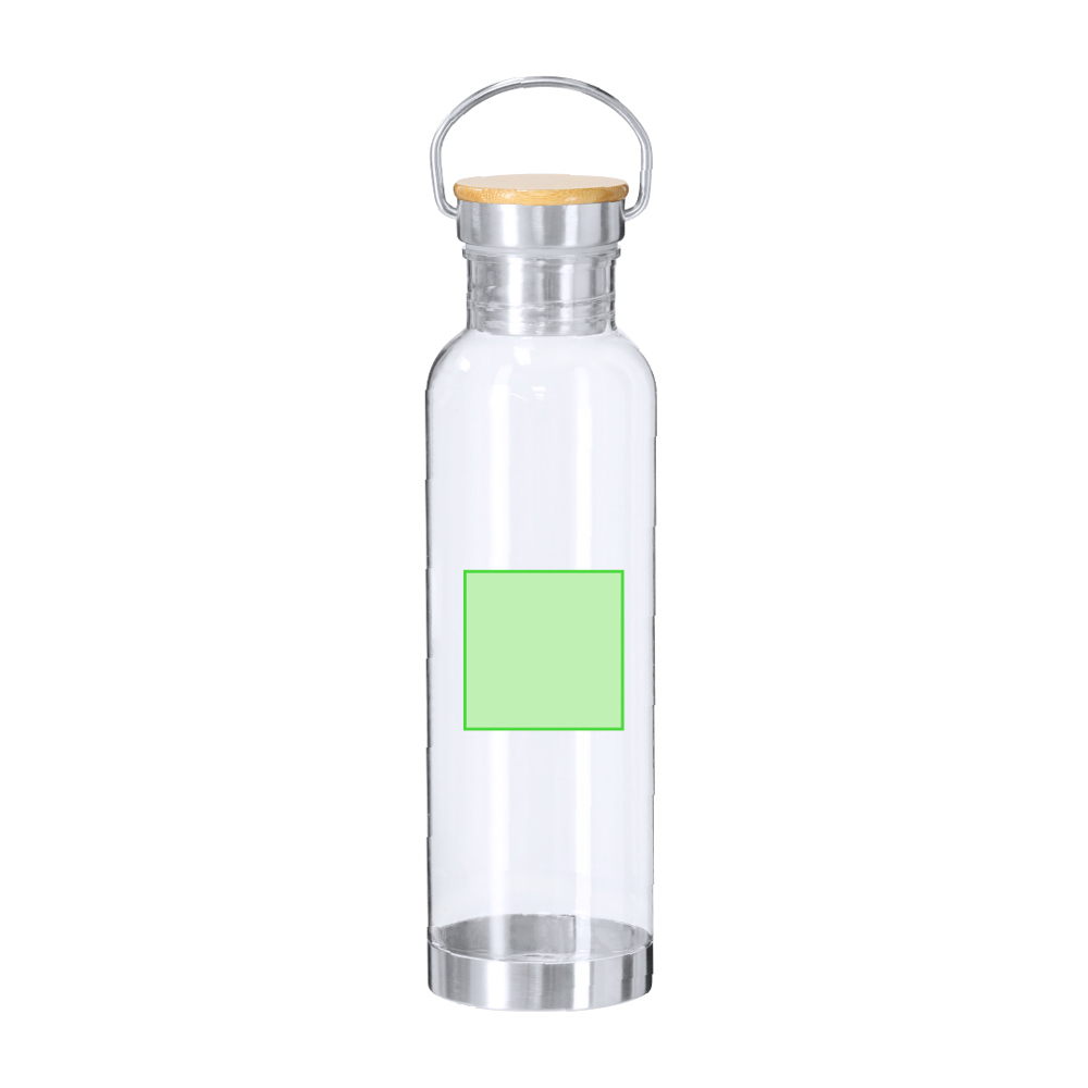 Bidon van 800 ml RPET met transparant RPET-lichaam. Schroefdop voorzien van roestvrijstalen draaghandgreep, bamboedop en roestvrijstalen bodem.RPET wordt gemaakt van gerecycled plastic, bevordert hergebruik van plastic afval en draagt bij aan duurzaamheid van de planeet. Materialen zoals bamboe stimuleren het gebruik van natuurlijke grondstoffen en verminderen vervuilende emissies. Bamboe komt van een zeer sterke en veelzijdige plant, met snelle groei en regeneratie, wat het een uitstekend alternatief maakt voor traditioneel hout.