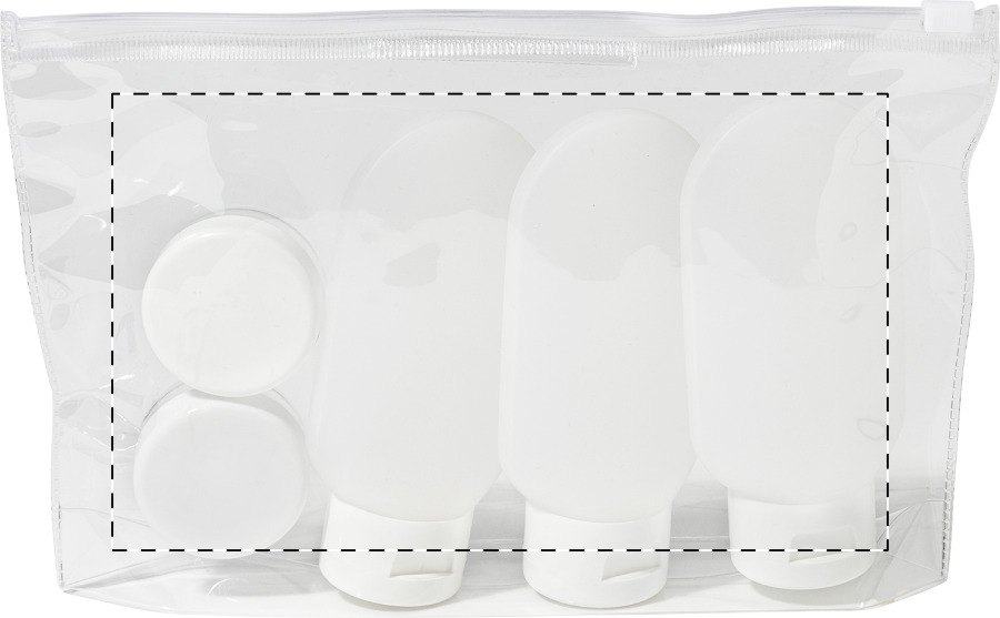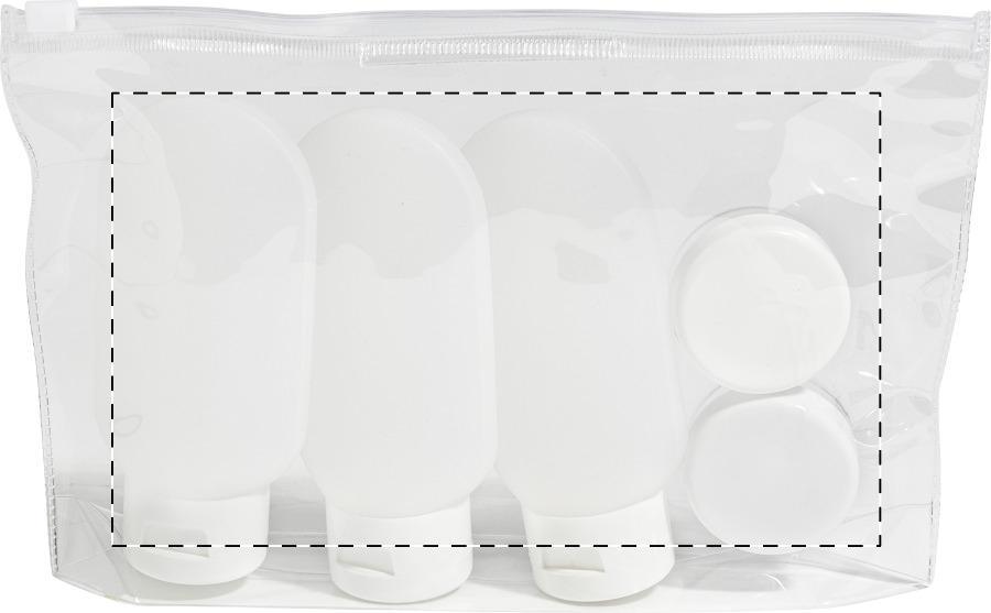 Reis make-up set met ritssluiting, transparant PVC-zakje en 5 navulbare containers.