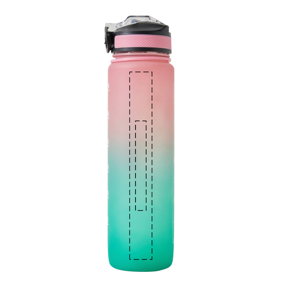 Sportwaterfles van RPET, motiverende tijdsaanduiding, met één hand te openen flip top deksel, veiligheidsslot en draagband.