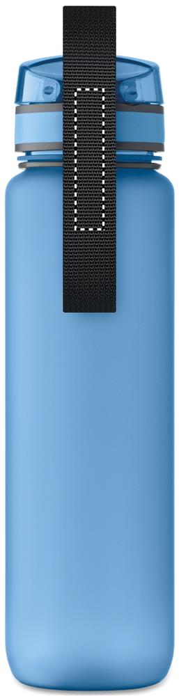 Sport drinkfles van BPA-vrij kunststof met afsluitbare deksel, drinktuit, draagriempje en inhoud van 1 L.