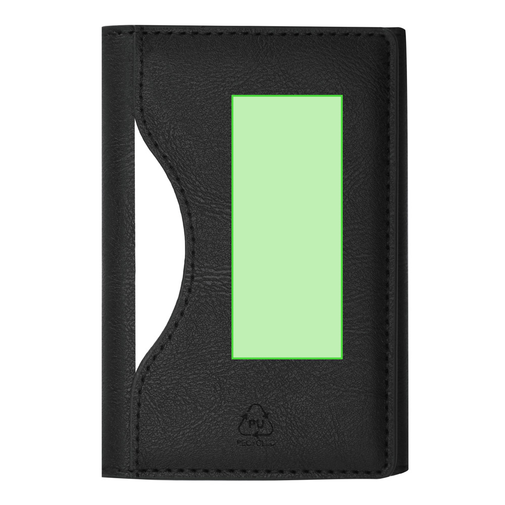 Kaarthouder in elegante gerecyclede PU. Met een magnetisch bevestigingssysteem. Bevat een gat aan de achterkant voor het gemakkelijk verwijderen van kaarten. Met een gerecyclede PU-badge.