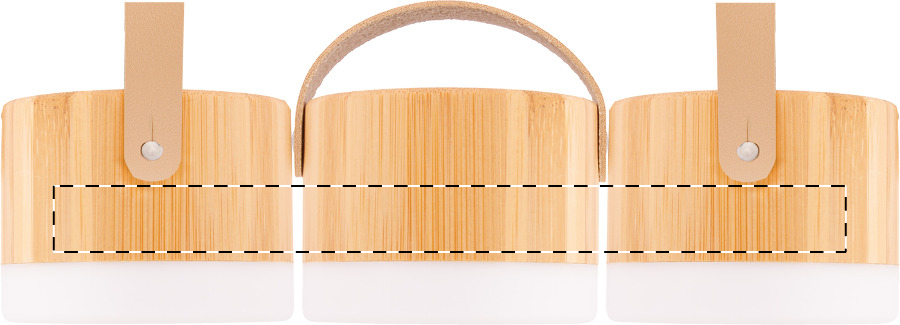 Draadloze speaker in bamboe en ABS plastic behuizing met LED-lampje aan de onderkant, PU leren draagriem en ingebouwde oplaadbare batterij.