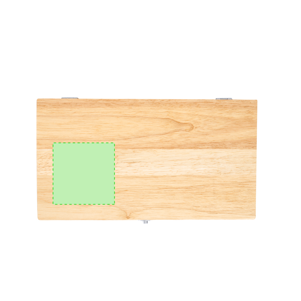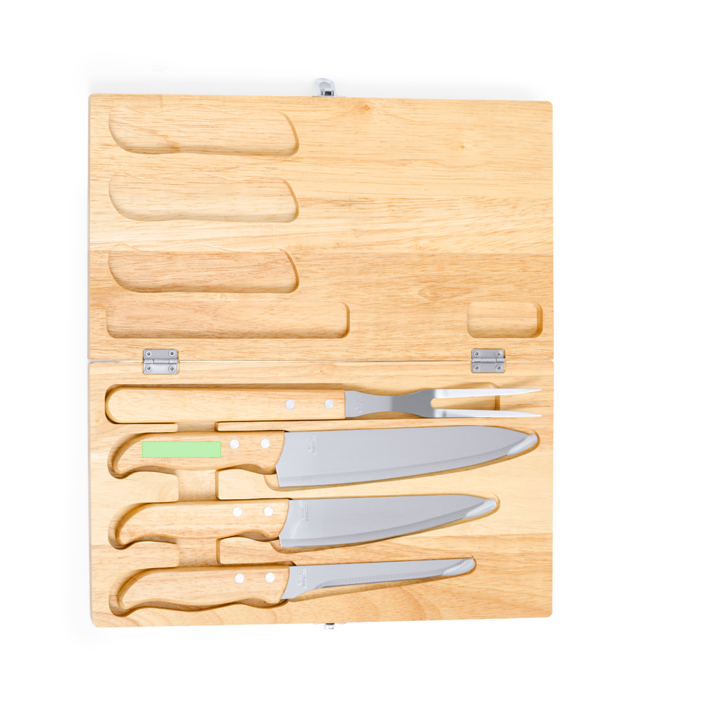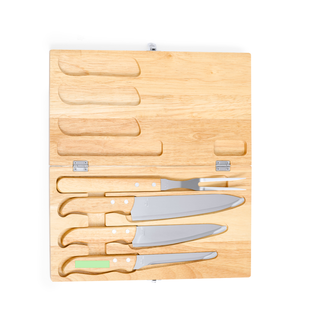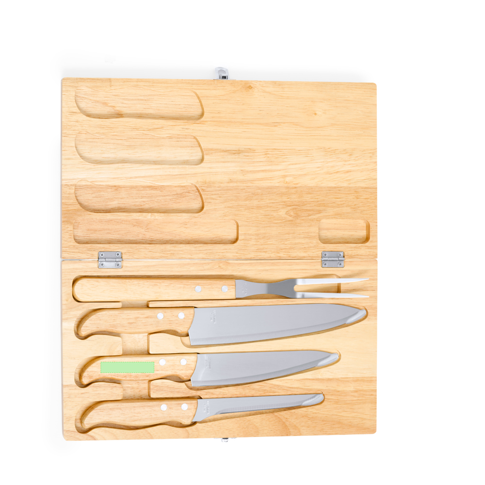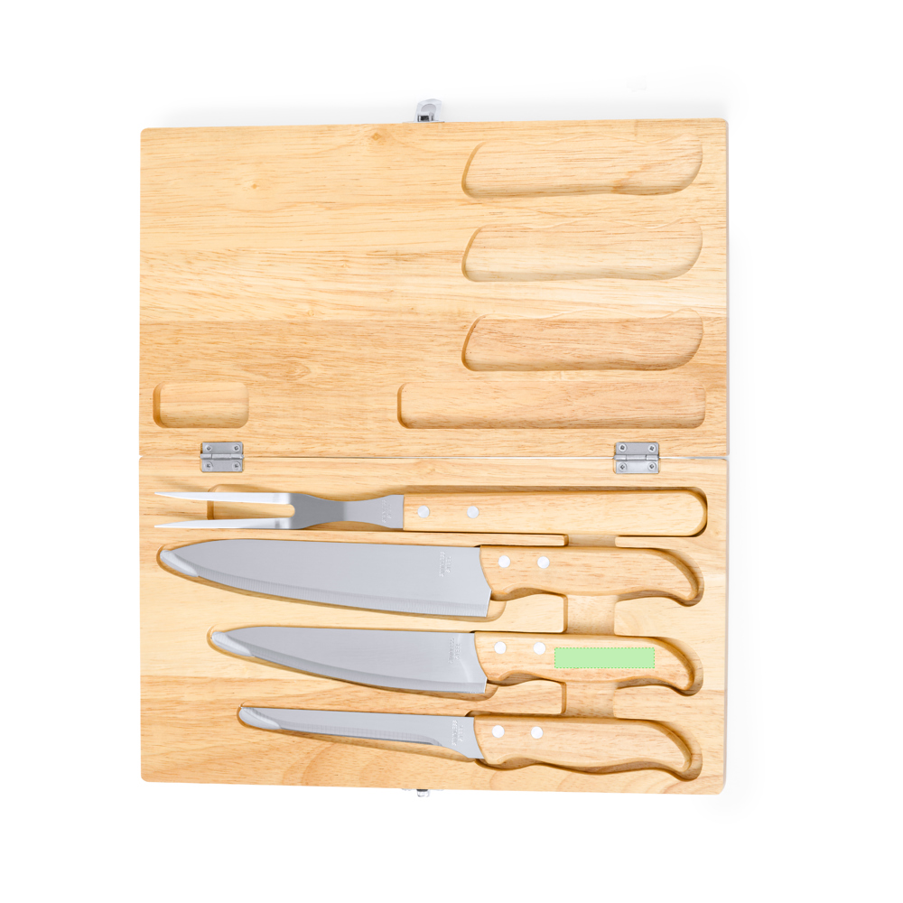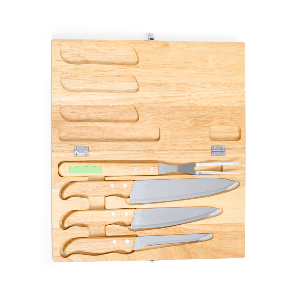 Messenset van natuurlijk hout en roestvrij staal, in gestanst houten kistje met metalen slot. Inclusief: vleesmes, uitbeenmes, fileermes en kookmes. Gepresenteerd in een kraft-designdoos.