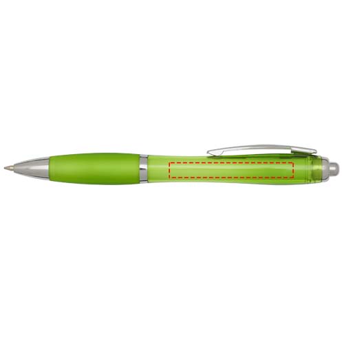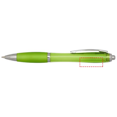 De Nash balpen van gerecycled plastic heeft een stijlvol, gebogen ontwerp met een transparante, gekleurde behuizing met zilveren accenten en een bijpassende zachte grip voor comfortabel schrijven. Het is gemaakt van RCS-gecertificeerd gerecycled ABS plastic, waardoor het gebruik van nieuwe grondstoffen wordt verminderd zonder dat dit ten koste gaat van de duurzaamheid. Op de achterkant staat een rABS-logo, dat aangeeft dat het product gerecycled materiaal bevat. Inktkleur: zwart. Stiftmaat: 1,0 mm. Schrijflengte: 1000 meter.