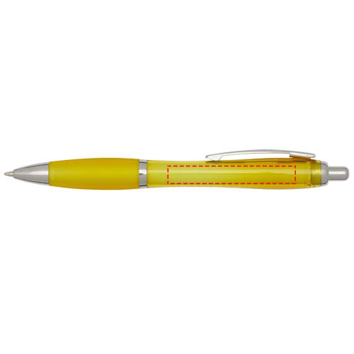 De Nash balpen van gerecycled plastic heeft een stijlvol, gebogen ontwerp met een transparante, gekleurde behuizing met zilveren accenten en een bijpassende zachte grip voor comfortabel schrijven. Het is gemaakt van RCS-gecertificeerd gerecycled ABS plastic, waardoor het gebruik van nieuwe grondstoffen wordt verminderd zonder dat dit ten koste gaat van de duurzaamheid. Op de achterkant staat een rABS-logo, dat aangeeft dat het product gerecycled materiaal bevat. Inktkleur: zwart. Stiftmaat: 1,0 mm. Schrijflengte: 1000 meter.