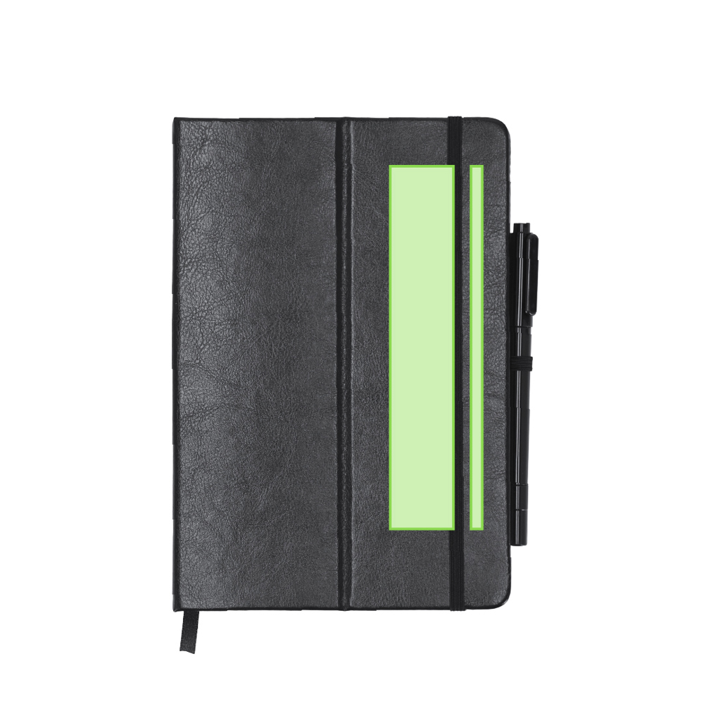 Notepad met stijve PU-hoezen. Bevat 80 vellen in een lijnopstelling, elastiek om vast te maken, een stoffen bladwijzer en bijpassende pen.
