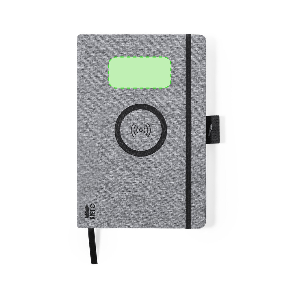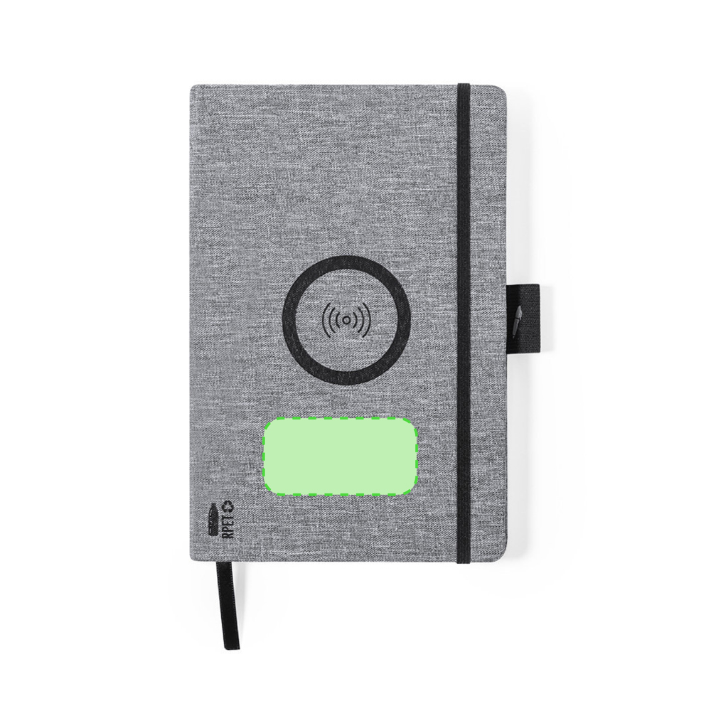 Natuurlijn A5-notitieblok van duurzaam 300D RPET-polyester, gemaakt van gerecycled plastic om het hergebruik van plastic afval aan te moedigen en de duurzaamheid van de planeet te helpen. Met 10W draadloze oplader geïntegreerd in de omslag. Inclusief 80 vellen met single-stripe lay-out. Compatibel met smartphones met draadloze oplaadtechnologie. Type C oplaadkabel en gebruiksaanwijzing in het Engels en Spaans.