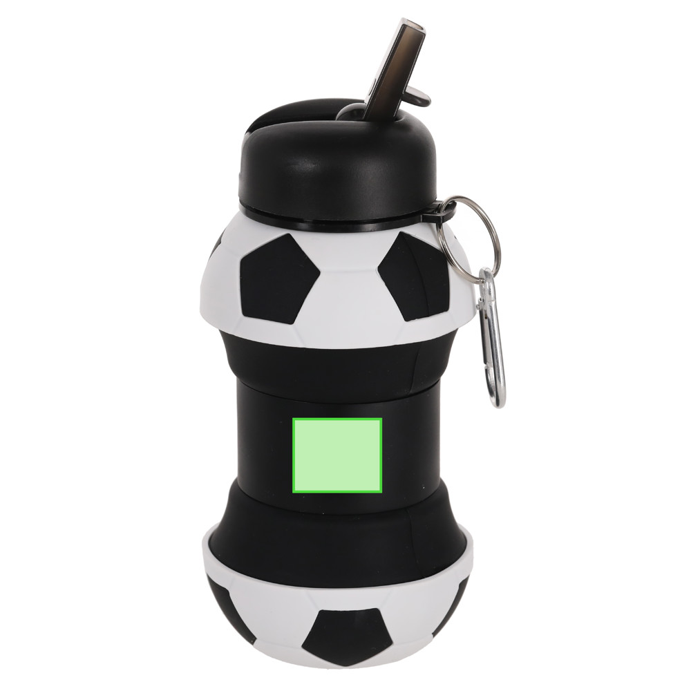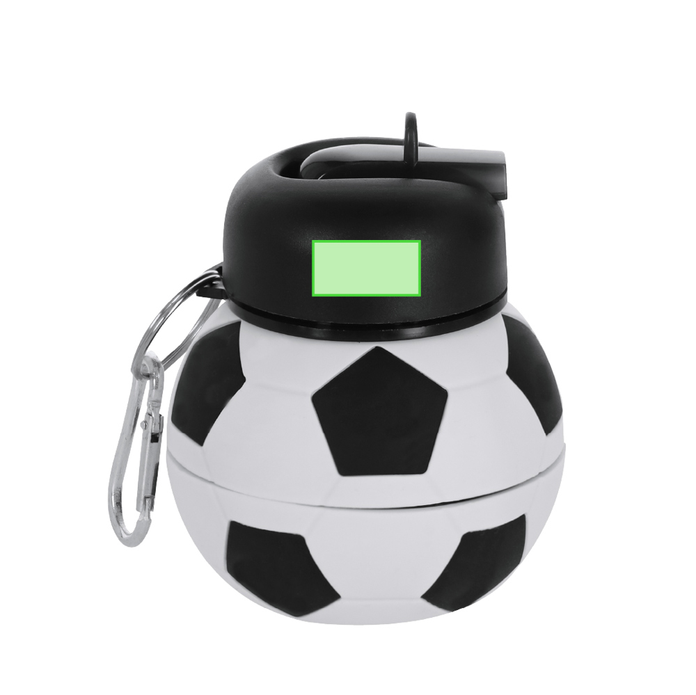 Opvouwbare fles met voetbalontwerp en een inhoud van 550 ml. Inclusief metalen ring met karabijnhaak voor praktisch vervoer. Schroefdop met nozzle. BPA-vrij.