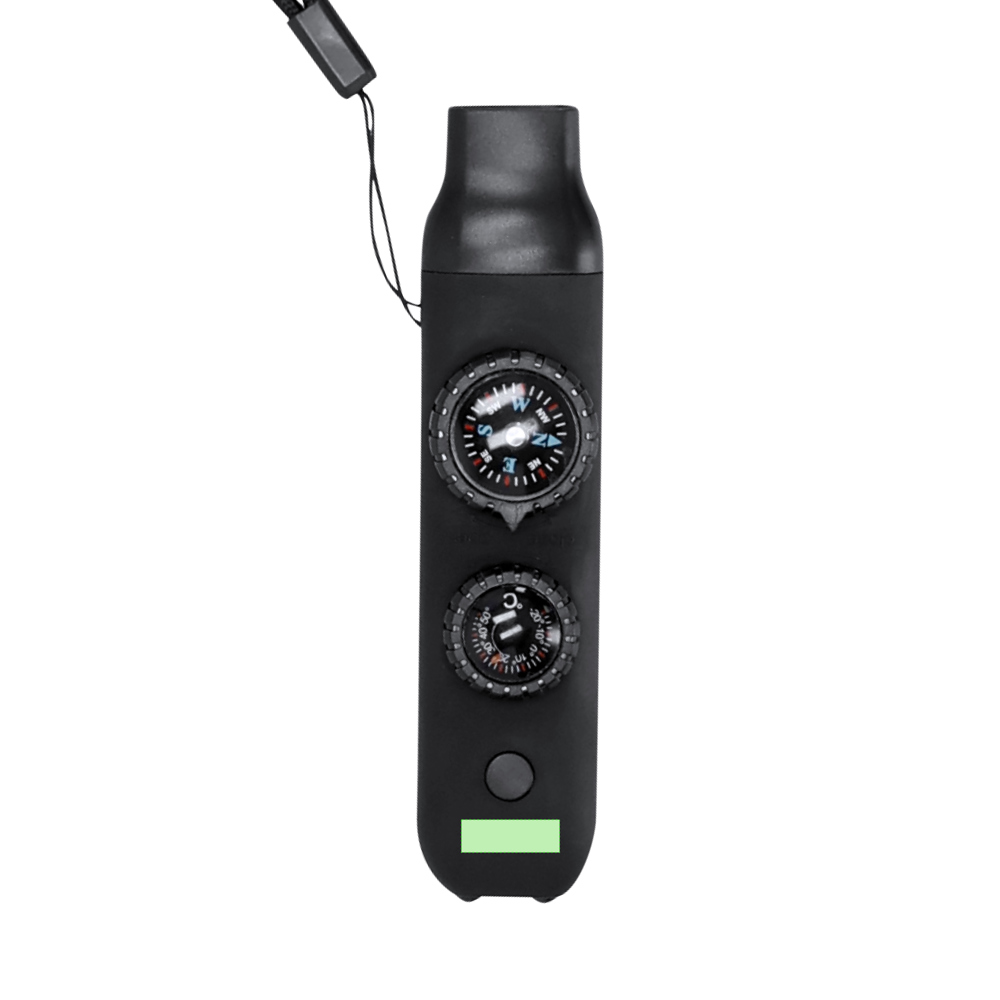 Survivalfluitje gemaakt van resistent ABS met een rubberachtige afwerking. Het integreert 6 essentiële functies: - Kompas van 2,55 cm in diameter, met aanduidingen van Noord, Zuid, Oost en West.- Krachtige fluit, ideaal voor het uitzenden van noodsignalen.- Thermometer met een temperatuurbereik van -20 ºC tot 50 ºC.- Vergrootglas van 2 cm diameter, perfect om kleine details te observeren of zelfs om vuur aan te steken door zonlicht te concentreren.- Spiegel, Ingebouwd onderaan het kompas.- Zaklamp met 2 leds en een aan/uit-knop bovenaan.Bevat een praktisch snoer voor gemakkelijk vervoer, ideaal om comfortabel om de nek te hangen.