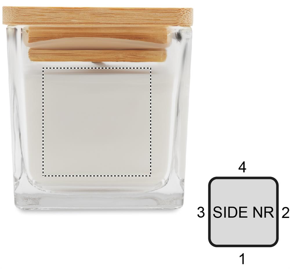 Geurkaars van plantaardige was in een vierkante glazen houder met een bamboe deksel. 50 gram. Brandtijd: 8 uur. Wit (06) vanille, geel (08) citroen, oranje (10) sinaasappel, groen (48) appel.