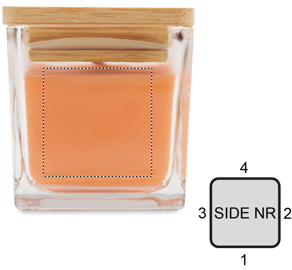 Geurkaars van plantaardige was in een vierkante glazen houder met een bamboe deksel. 50 gram. Brandtijd: 8 uur. Wit (06) vanille, geel (08) citroen, oranje (10) sinaasappel, groen (48) appel.