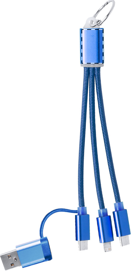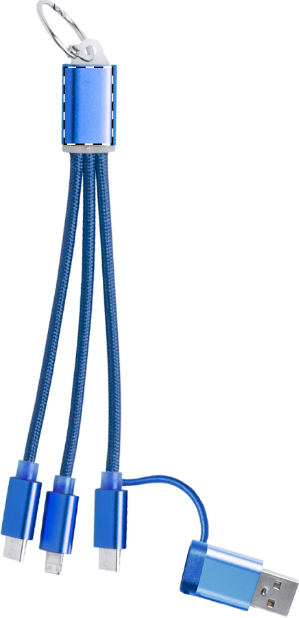 Aluminium USB-oplaadkabel met sleutelring. Met micro-USB-, USB-C- en Lightning-connectoren. Met USB- en USB-C-ingangen.