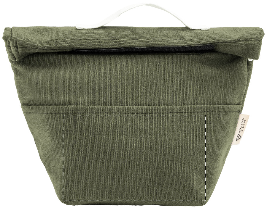 Gerecycleerde canvas rolltop koeler tas met voorvak, aluminium vulling en klittenbandsluiting. 70% gerecycled katoen en 30% RPET polyester. Met onderscheidend gerecycled katoenen label.