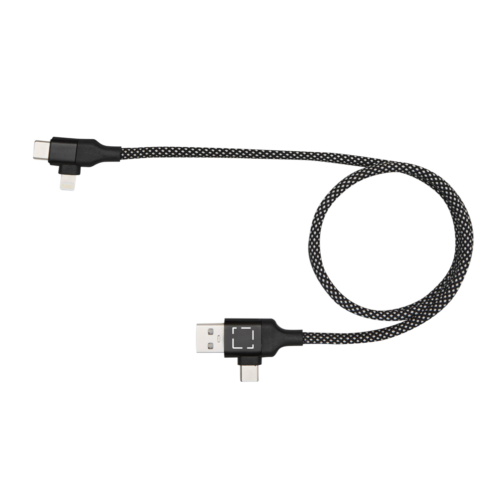 Nylon laadkabel met USB aan één uiteinde en aan de andere kant micro USB, USB-C en Lightning.
