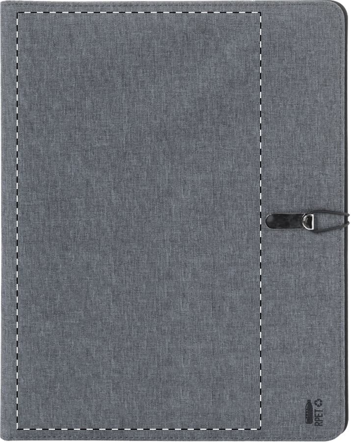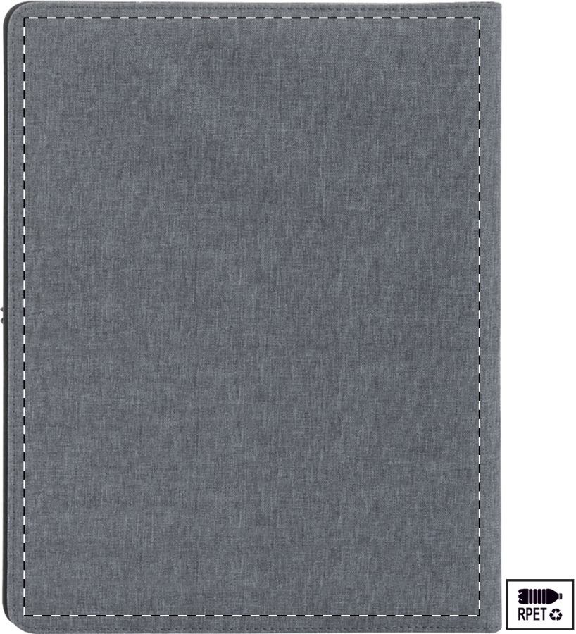 A4-formaat, 300D RPET polyester documentenmap met 25 gelinieerde vellen notitieblok en meerdere organiseervakken aan de binnenkant.