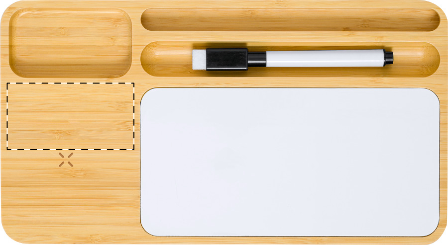 Bamboe bureau-organizer en mobiele telefoonhouder met whiteboard-oppervlak en ingebouwde draadloze snellader (15W).