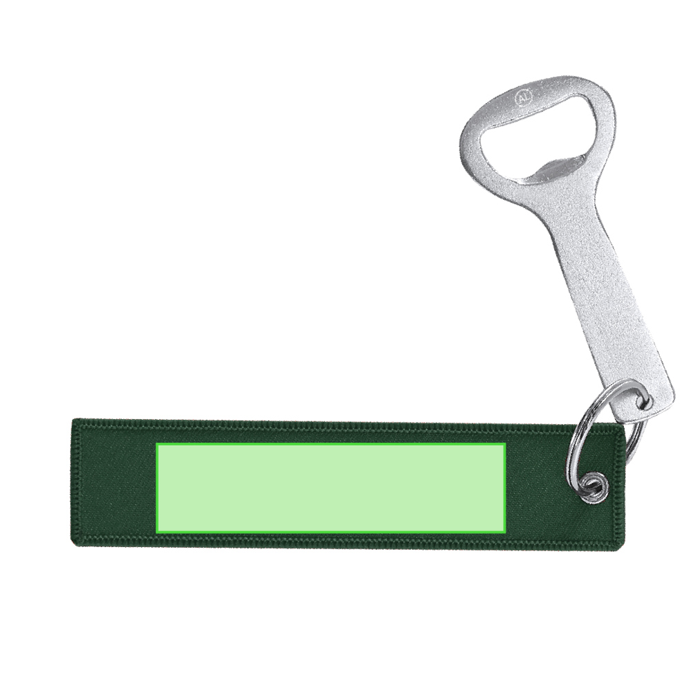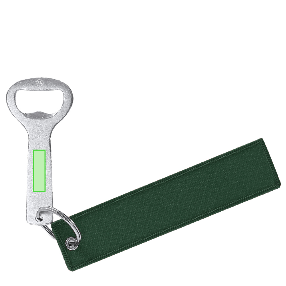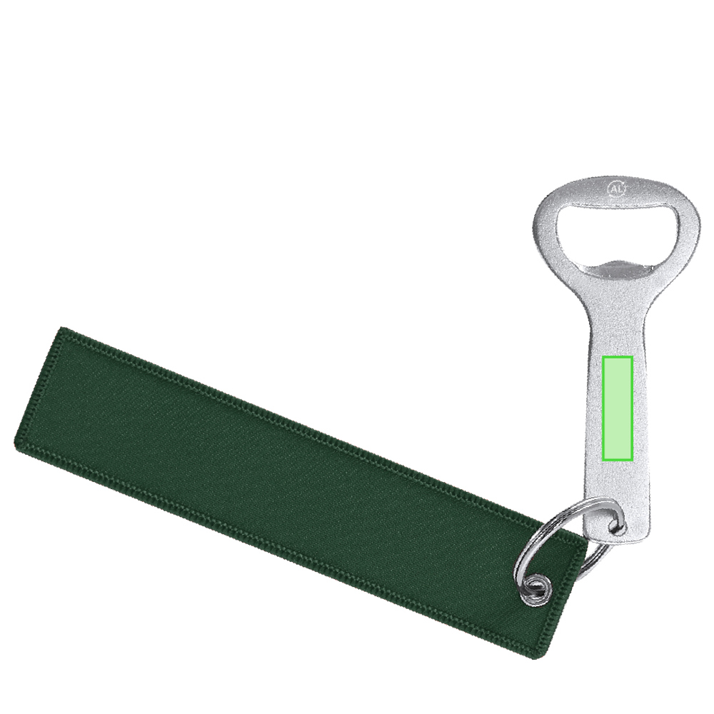 Sleutelhangeropener van gerecycled aluminium met naden aan de rand in kleur die passen bij het polyester lichaam. Bevat twee zilveren metalen ringen. De hoofdring bevat een klassieke opener met een kenmerkend gerecycled aluminium logo gegraveerd aan het bovenste uiteinde.