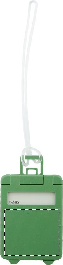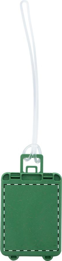 Ecologisch plastic bagagelabel van tarwestro in de vorm van een trolleytas, met elastische band.