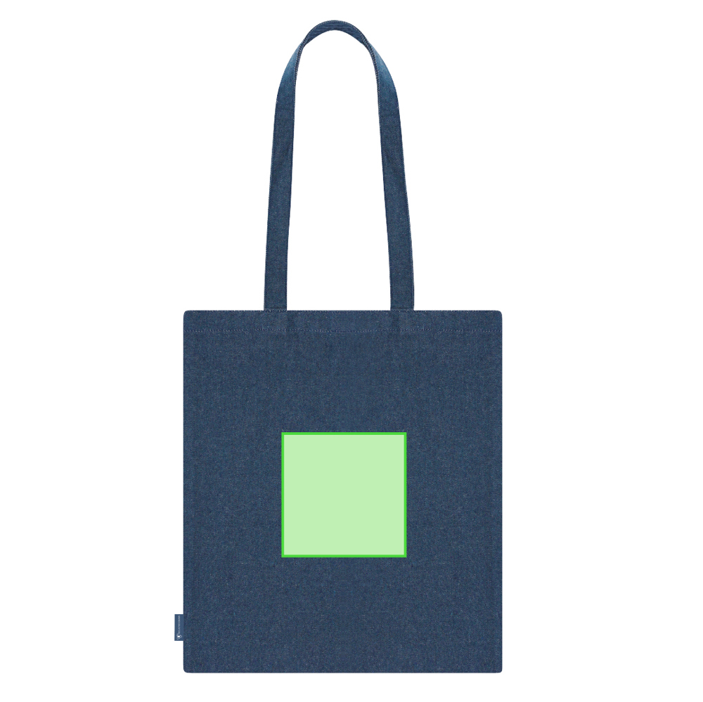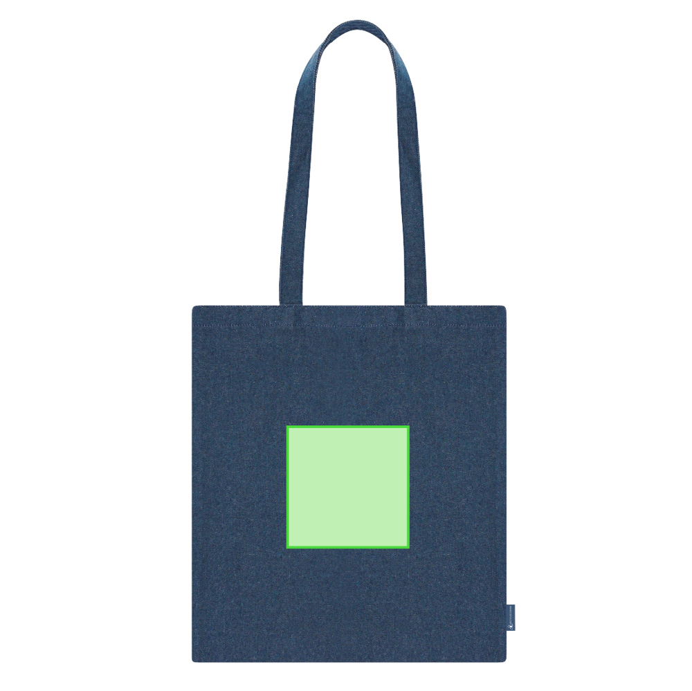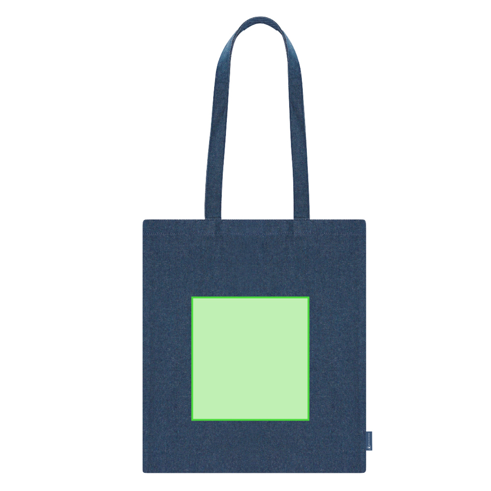 Tas gemaakt van gerecyclede denim stof van 300 g/m2. Lange handvatten van 70 cm met versteviging, genaaide afwerking. Gerecyclede denimlogo op het zijlabel en weerstand tot 8 kg gewicht.