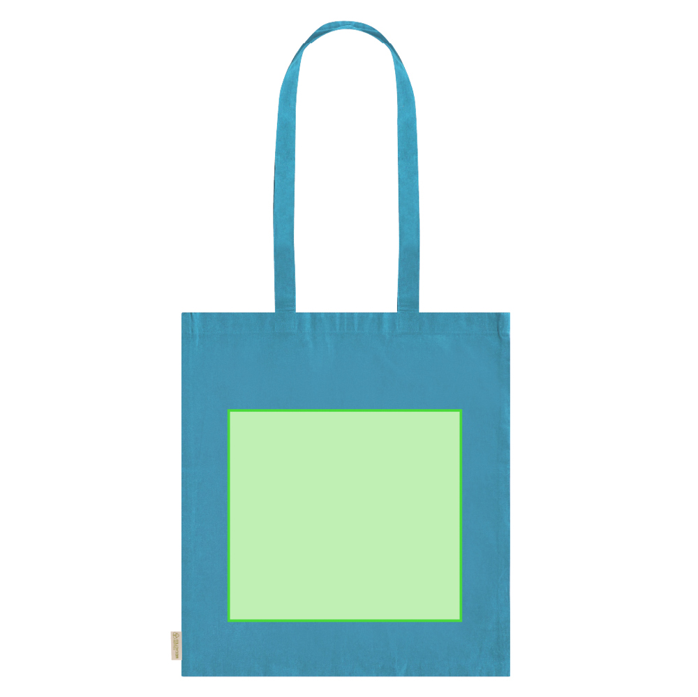 Tas gemaakt van 140 g/m2 gerecycled katoen . Lange handvatten van 70 cm met versteviging, genaaide afwerking. Logo op zijlabel en weerstand tot 6 kg gewicht