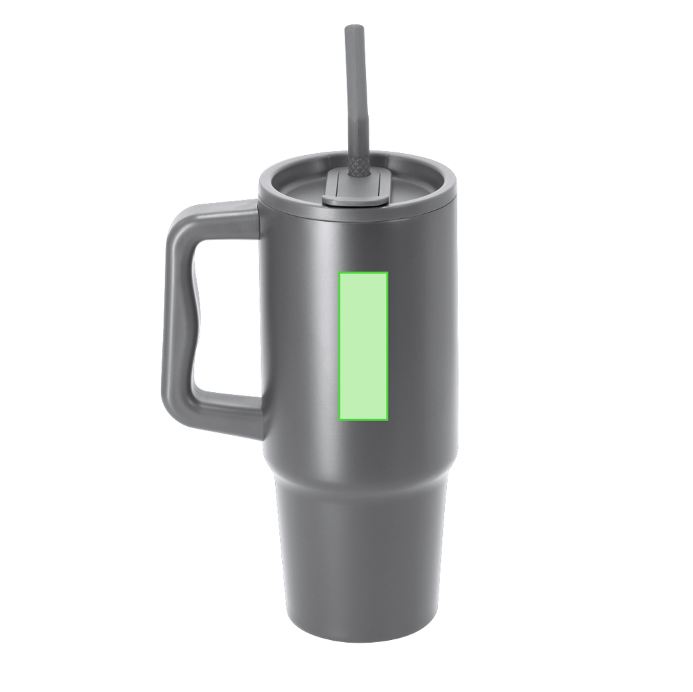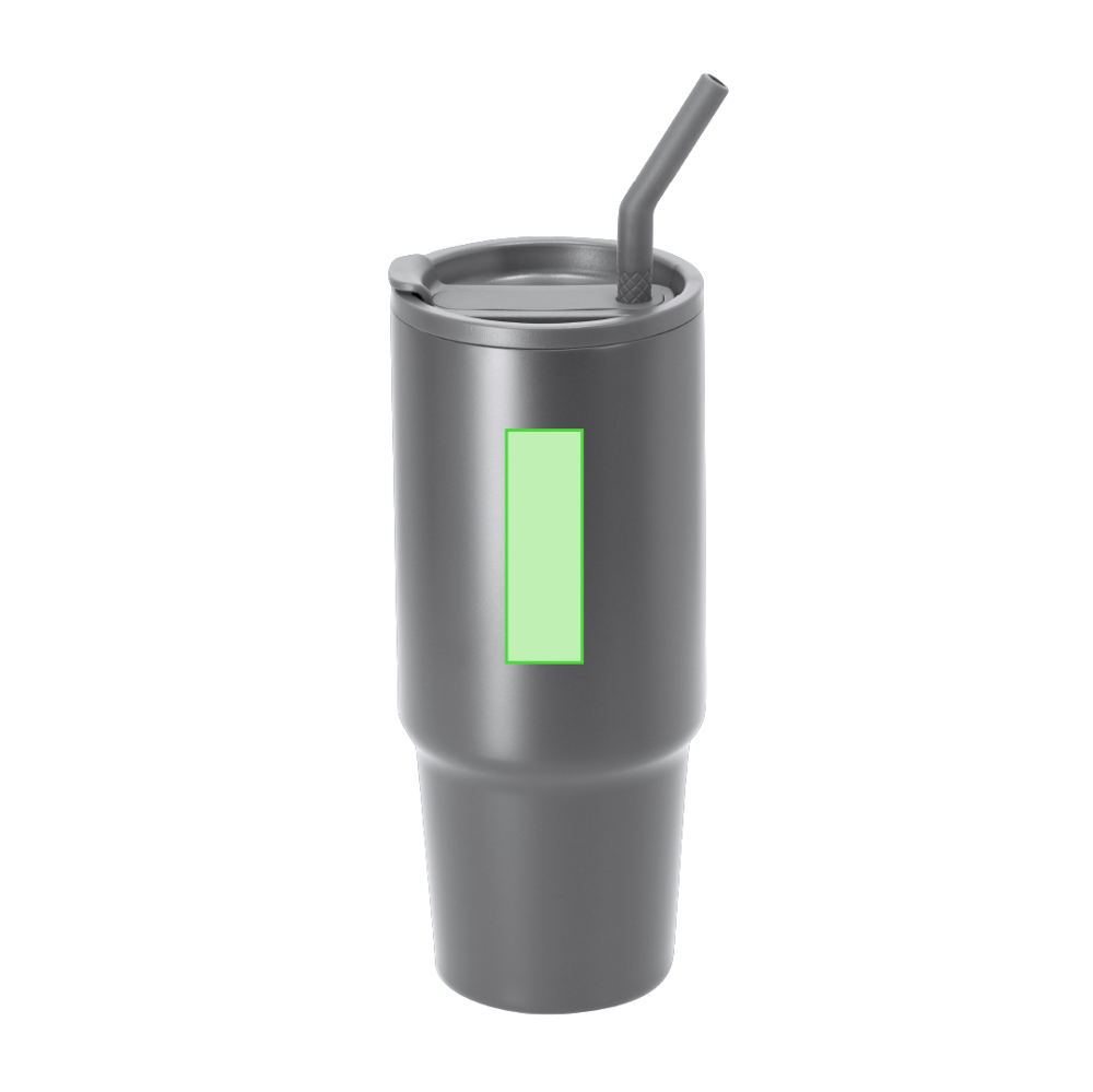 Thermisch vat met 900 ml capaciteit en dubbele wand. Gemaakt van gerecycled roestvrij staal. Het heeft een dubbel drinksysteem: gat met hermetische sluiting en geïntegreerd rietje, aangepast aan de gebruiksvoorkeuren. Met een hermetisch afsluitingssysteemdeksel. Inclusief praktisch draaghandvat, ideaal voor gemakkelijk transport in elke situatie. BPA-vrij. Met gerecycled roestvrijstalen badge.