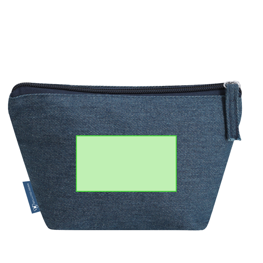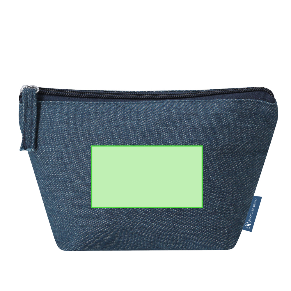 Toilettetas voornamelijk gemaakt van gerecyclede denimstof. Hoofdcompartiment met ritssluiting. Inclusief buitenlabel met logo van gerecycled denim.