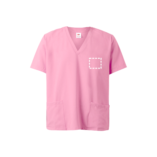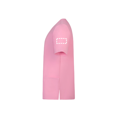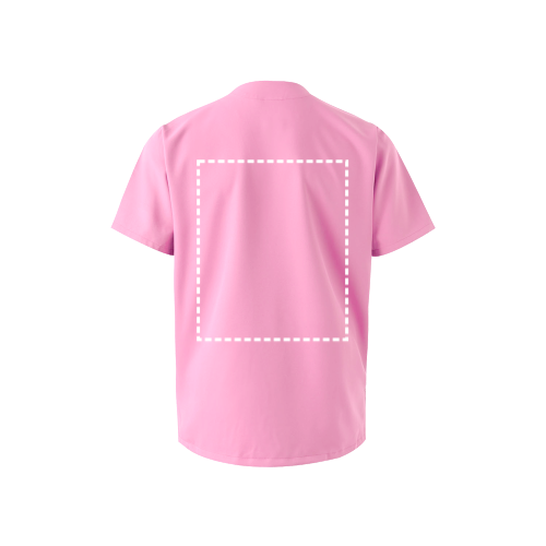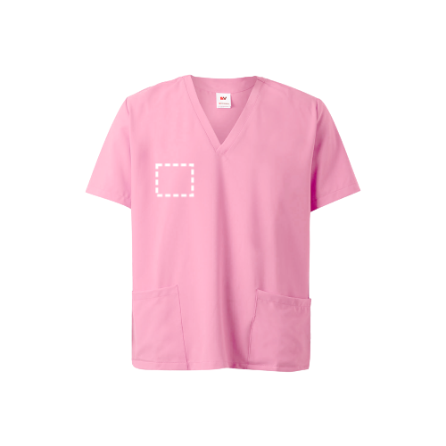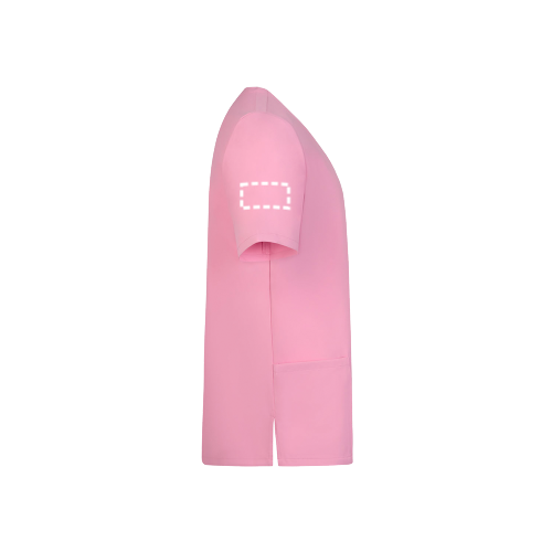 Unisex-servicehemd met korte mouwen. Gekruiste piekhalslijn. Zak op de borst en twee zijzakken. Zijsplitten aan de zoom.