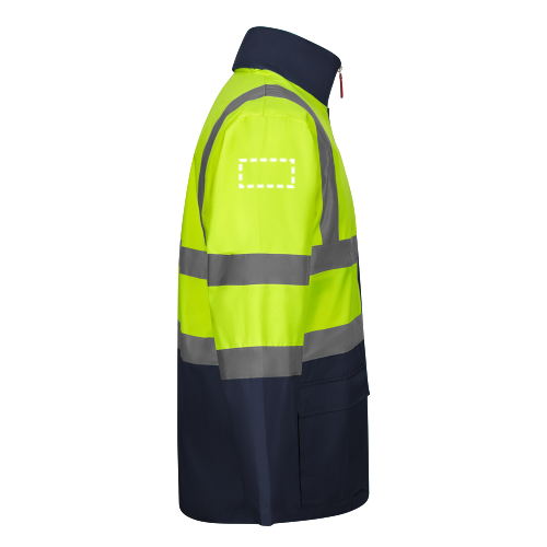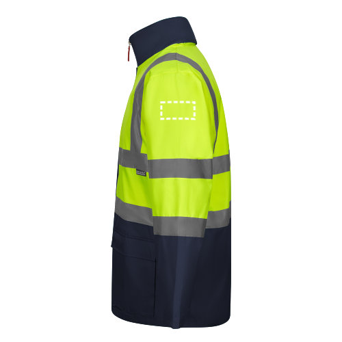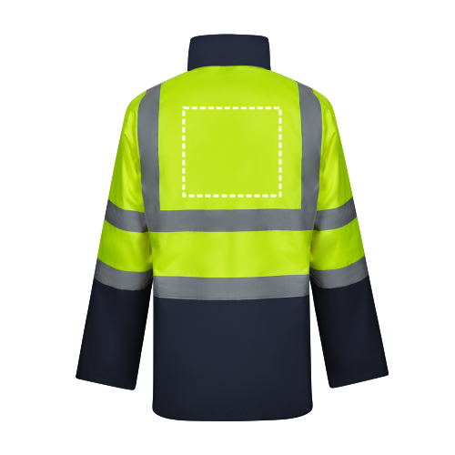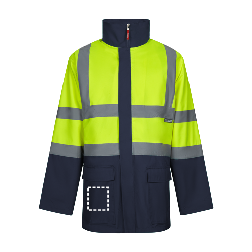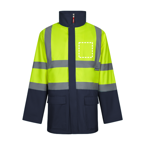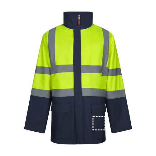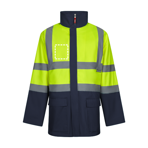 Tweekleurige 4-in-1 parka (180g/m²), van polyester (100%) met PU-coating. Vier stuks in één: parka, regenjas, jack en vest. Parka/regenjas: met verborgen centrale ritssluiting met sluiting met klittenband, reflecterende strepen op de romp, schouders en mouwen en verborgen capuchon, met twee zakken onderaan. Jas/vest: met centrale ritssluiting, reflecterende strepen op de romp en schouders, geribde manchetten en afritsbare mouwen. Met drie zakken (2 onderste zakken en 1 binnenzak). Product in overeenstemming met EU-verordening 2016/425, gecertificeerd door EN20471 en klasse Nº 2. Maat: 4XL,5XL