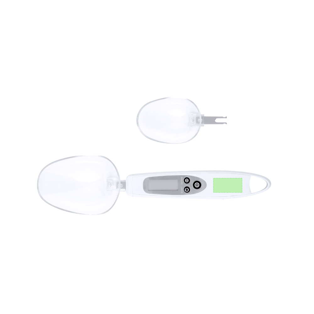 Praktische digitale weegschaal met lepel, geschikt voor vloeistoffen en vaste stoffen. Inclusief 2 verwisselbare lepels en LCD digitale display in het handvat, waarop het gewicht met een nauwkeurigheid van 0,1 g wordt weergegeven. Knop om het gewicht weer te geven in grammen (g), ounces (oz) of milliliters (ml), met geheugenfunctie en mogelijkheid om twee ingrediënten af te wegen. Beide lepels zijn gegraveerd met een extra maatverdeling voor vloeistoffen: de kleine lepel van 5ml tot 25ml; en de grote lepel van 10ml tot 50ml. Met handleiding in het Engels en Spaans. Aangedreven door knoopcelbatterij (inbegrepen) en individueel gepresenteerd in een kraft design doosje.